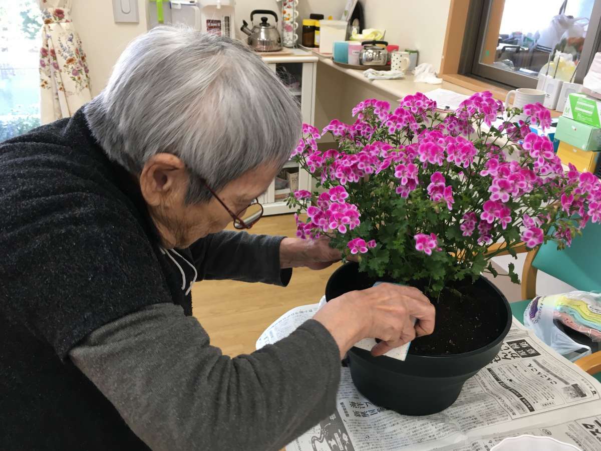 ホームの敷地内に咲いていたお花を、鉢に植え替えています。