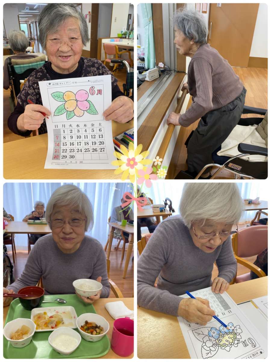 こんにちは。みんなの家・大宮内野本郷のコダマです(^。^) 花の丘公園そば。さいたま市西区。 宮原駅西口よりバス6分&徒歩4分のところにある施設です。 ここ数日夏日が続いていて、体調管理も大変ですね。しっかり食べて、免疫upしましょう♬ さて二階フロアの皆様は☆☆☆ お昼ご飯前に『集団体操や口腔体操・早口言葉』などしっかり30分行われ(*^o^*)食欲旺盛♡♡♡ 午後も、漢字パズルや季節の塗り絵に取り組まれる方☆ スタッフと一緒に、紫陽花の折り紙や葉っぱを台紙に糊付けし『6月のカレンダー』を創作される方♡などなど 今日も賑やかな二階フロアのご様子でした(๑˃̵ᴗ˂̵)