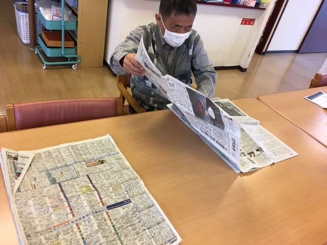 男性の利用者様は、新聞を1枚1枚丁寧に折ってくださっております。
