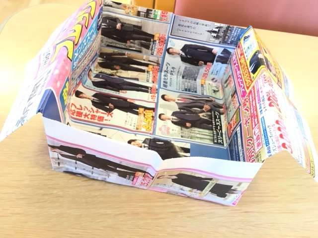 普段捨ててしまうチラシをリサイクルとして☆そして、みんなで輪になって箱づくり。
