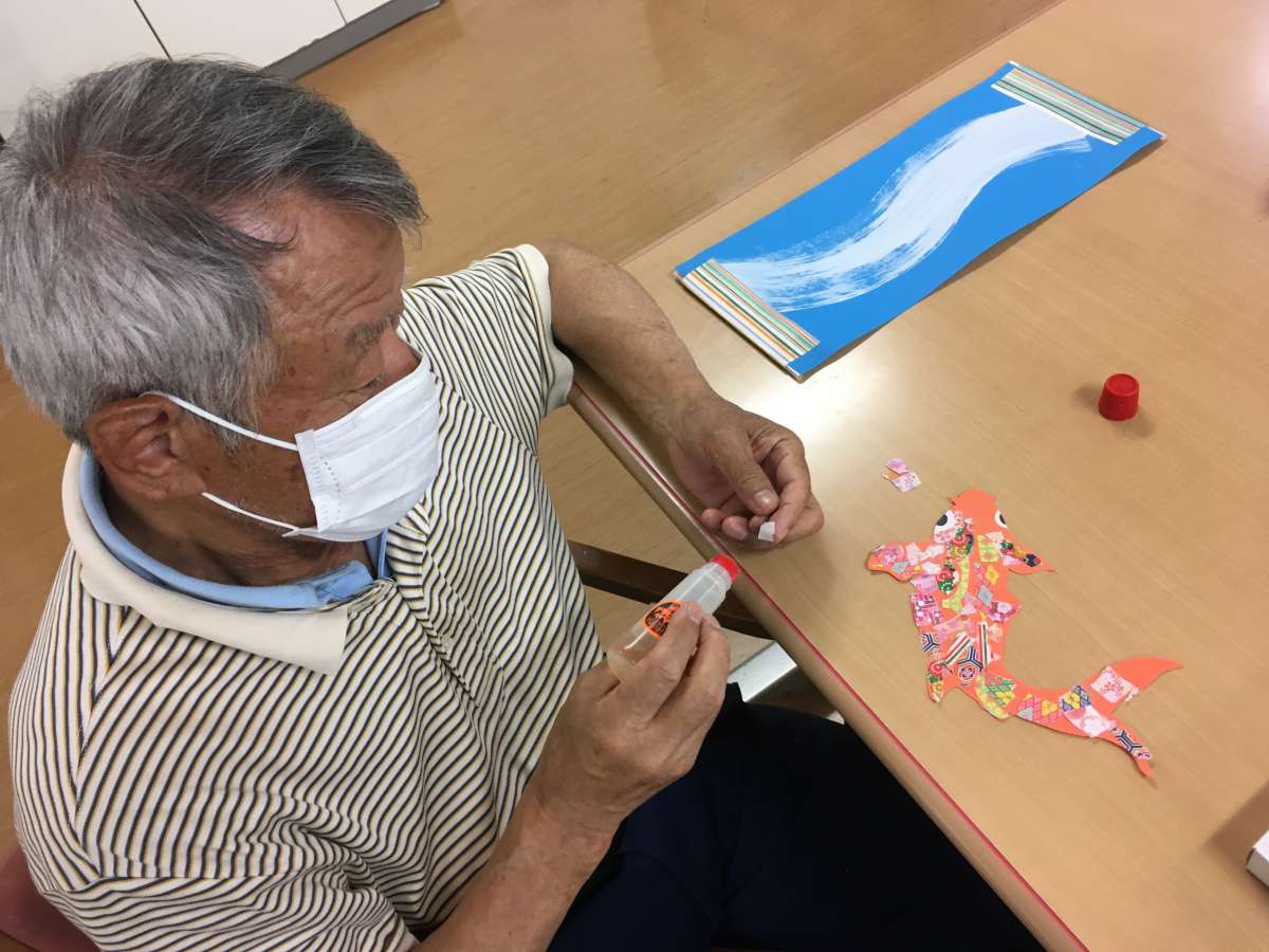 今月の工作は掛け軸風に鯉の滝登りを作りました!鯉の形の画用紙に千代紙でちぎり絵のように貼って頂きました。