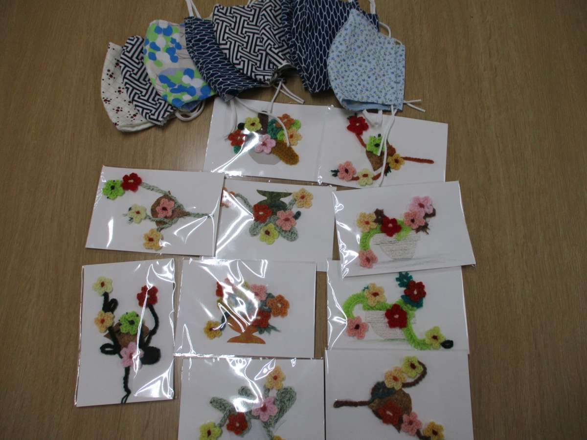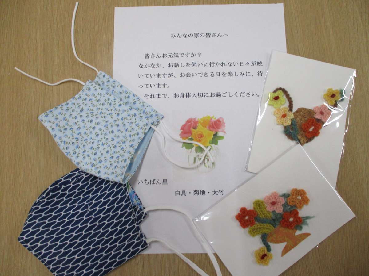 さて、ボランティアの「いちばん星」様から、手作りマスク10枚、絵手紙10枚程頂きました。