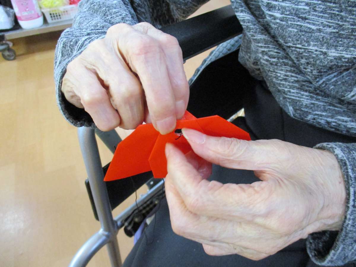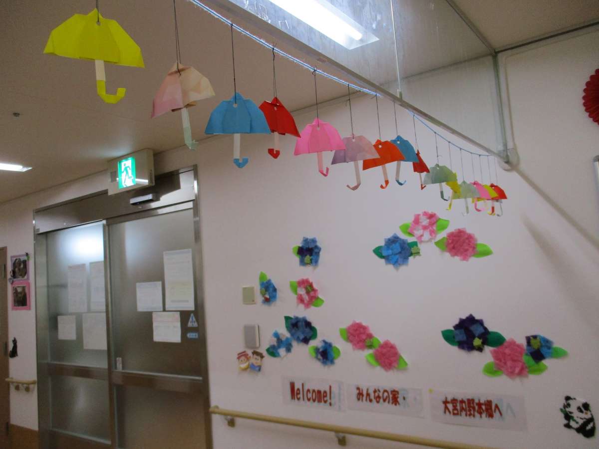 こんにちは~みんなの家・大宮内野本郷ですo(^o^)o 花の丘公園そば。さいたま市西区。 宮原駅西口よりバス6分&徒歩4分のところにある施設です(⌒‐⌒) 施設の飾りを5月の鯉のぼりから6月になったので(梅雨)をイメージして傘を作りました♪ 上からぶら下げるために入居者様が小さな穴に刺繍糸を通して結んで下さいました\(^_^)/ こんなに細かい作業が出来るとはスタッフビックリしました(^ω^) 出来上がりも可愛く仕上がりました♪