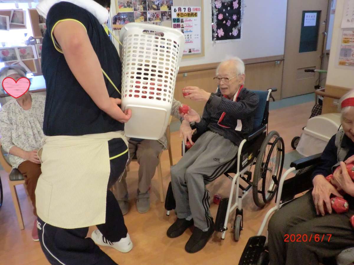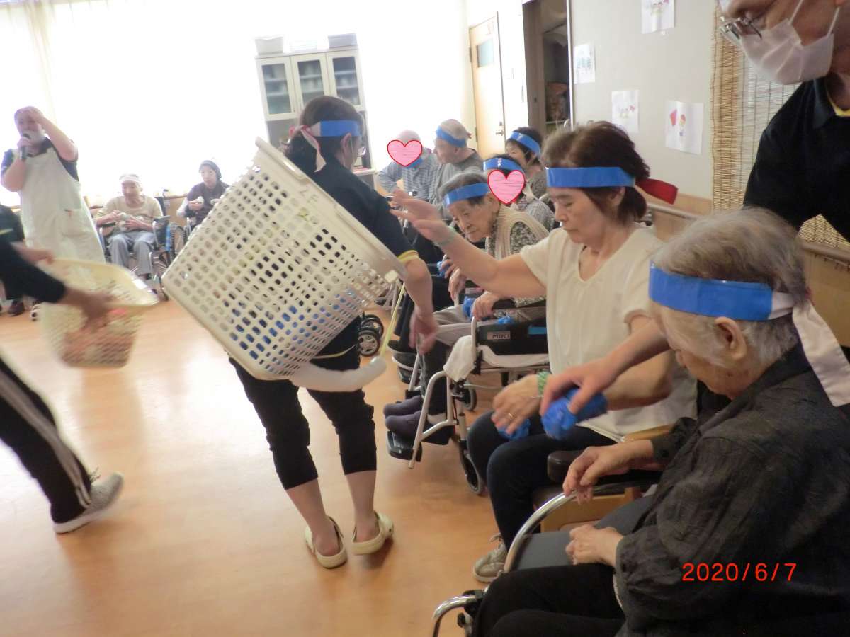 上宗岡ルールで、籠を背負った職員が動き回り、ご利用者様にチームカラーの玉を入れて頂きます。
