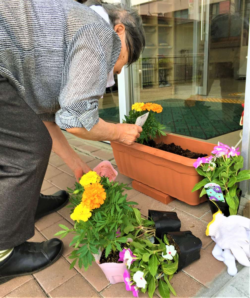 職員が近くで見守る中、お二人ともせっせとお花を植えていきます。