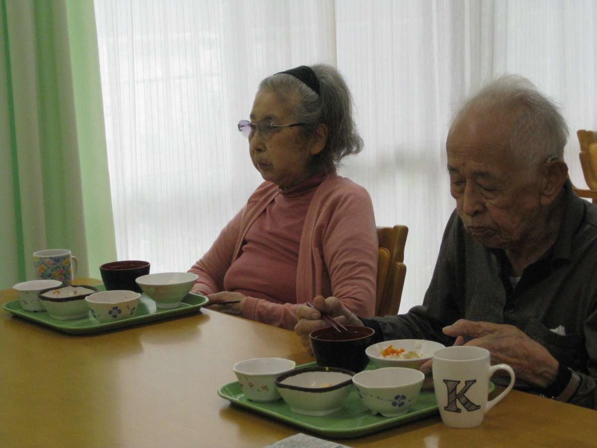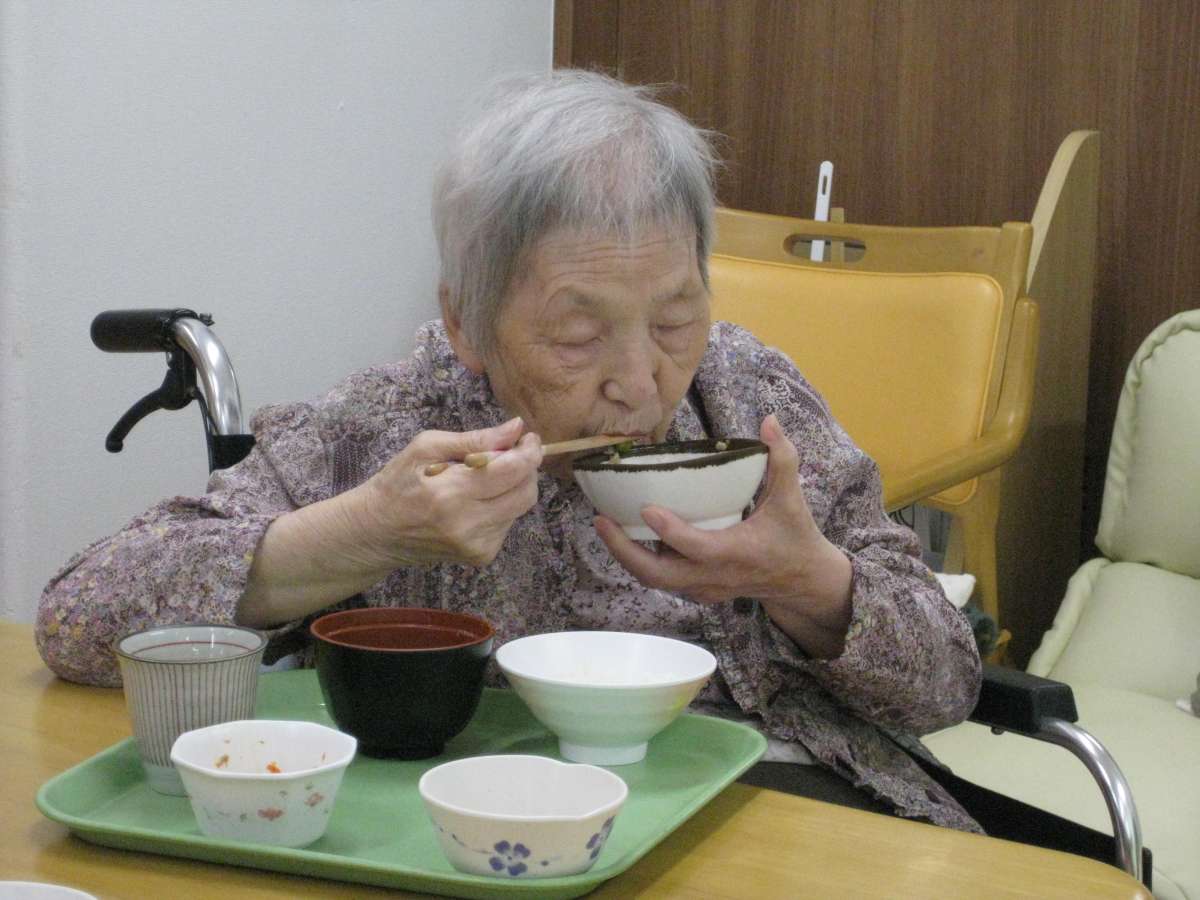 GHあきがせホール内にてお食事の風景です。黙々と召し上がりみんな良い顔しています。完食です・・・・ 葉だいこんをが入ってるもお味噌汁です。美味しかった、お腹いっぱい~とのお話しでした!!