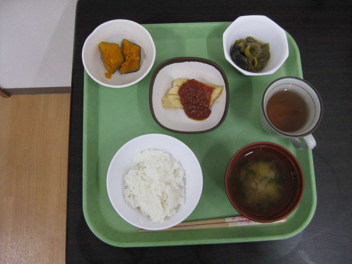 今日のお昼の献立です。ごはん・味噌汁・カレイのムニエル・茄子の味噌炒め・カボチャの煮物です。美味しそう・・・ 皆で食べると良いですねえ・・・!!