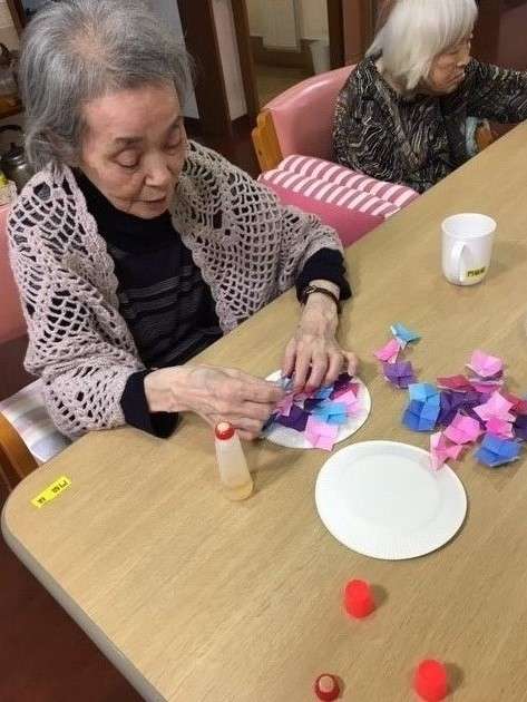 折り紙をクルクル、ペタペタ…「何色が足りない?」とお話ししながら