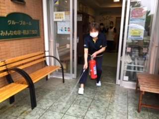そして、夜勤明け職員と、昨日参加出来なかった職員4名は、次の日 水消火器訓練とDVD鑑賞を行いました。