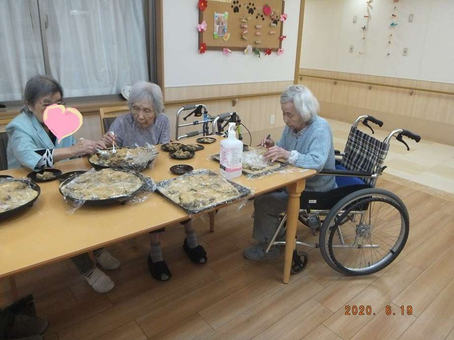 梅雨入り後さえないお天気が続いていますが、みんなの家・大和田では利用者様、皆様が大好きな甘い和菓子、わらび餅を利用者様と手作りし、 きな粉にまぶし美味しく頂きました。 60人分作ろうと思ったら、100人分位できてしまいました。スプーンでちぎって小皿に飾り付け存分に召し上がりました。