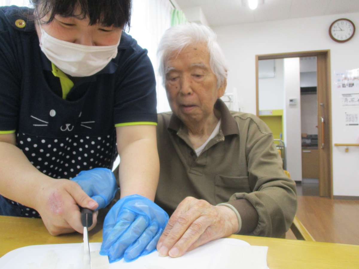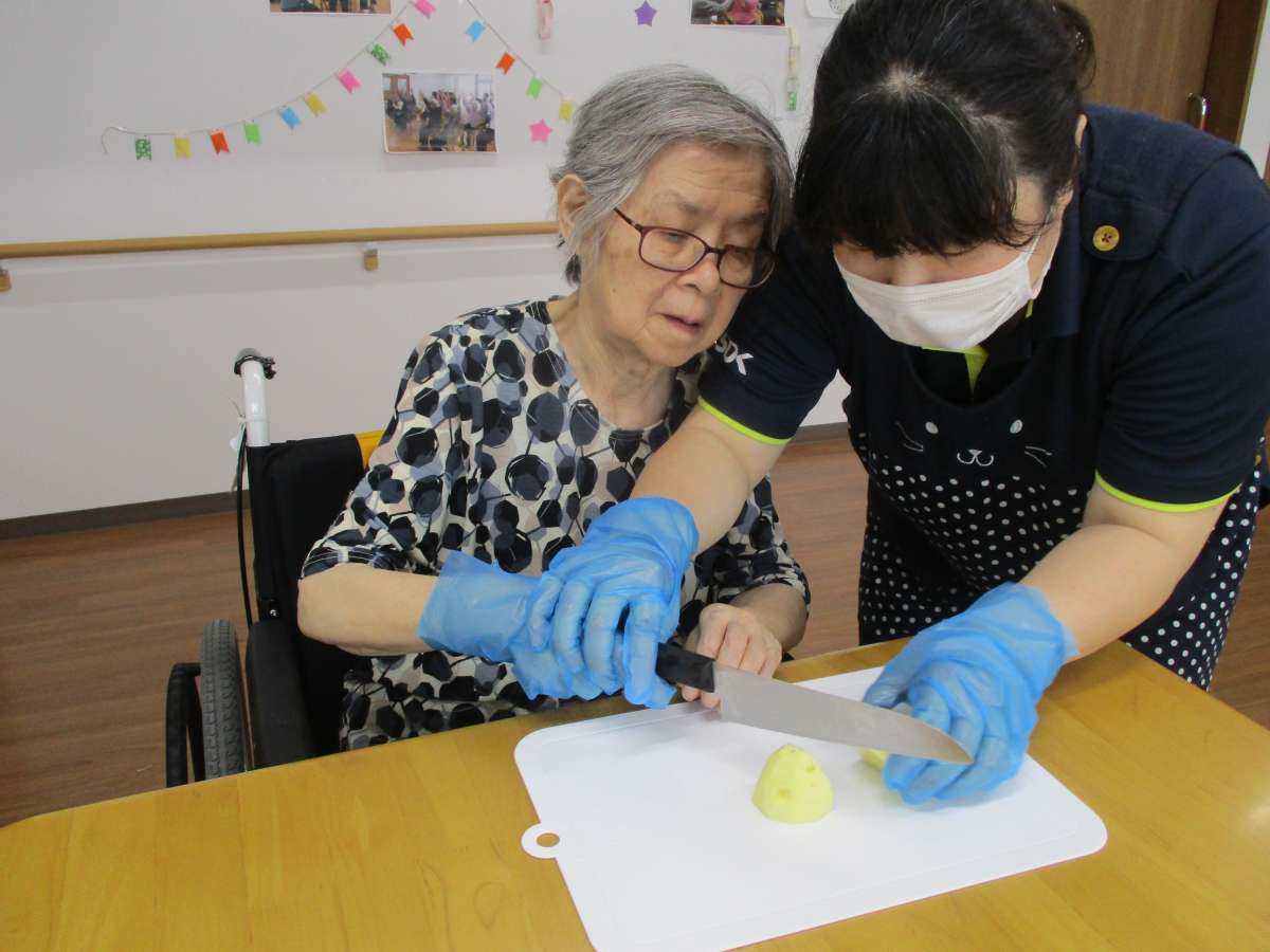 GHあきがせ ホール内で豚汁を作りました。さすがお母様方ですね・・・ お父様も挑戦していました・・・(笑) 怪我のないように介護職員が付き添いのもとジャガイモや大根を切っていました。さすが慣れた手つきですねえ~ あっという間に材料がそろいました。皆真剣で良い顔して挑戦していました。