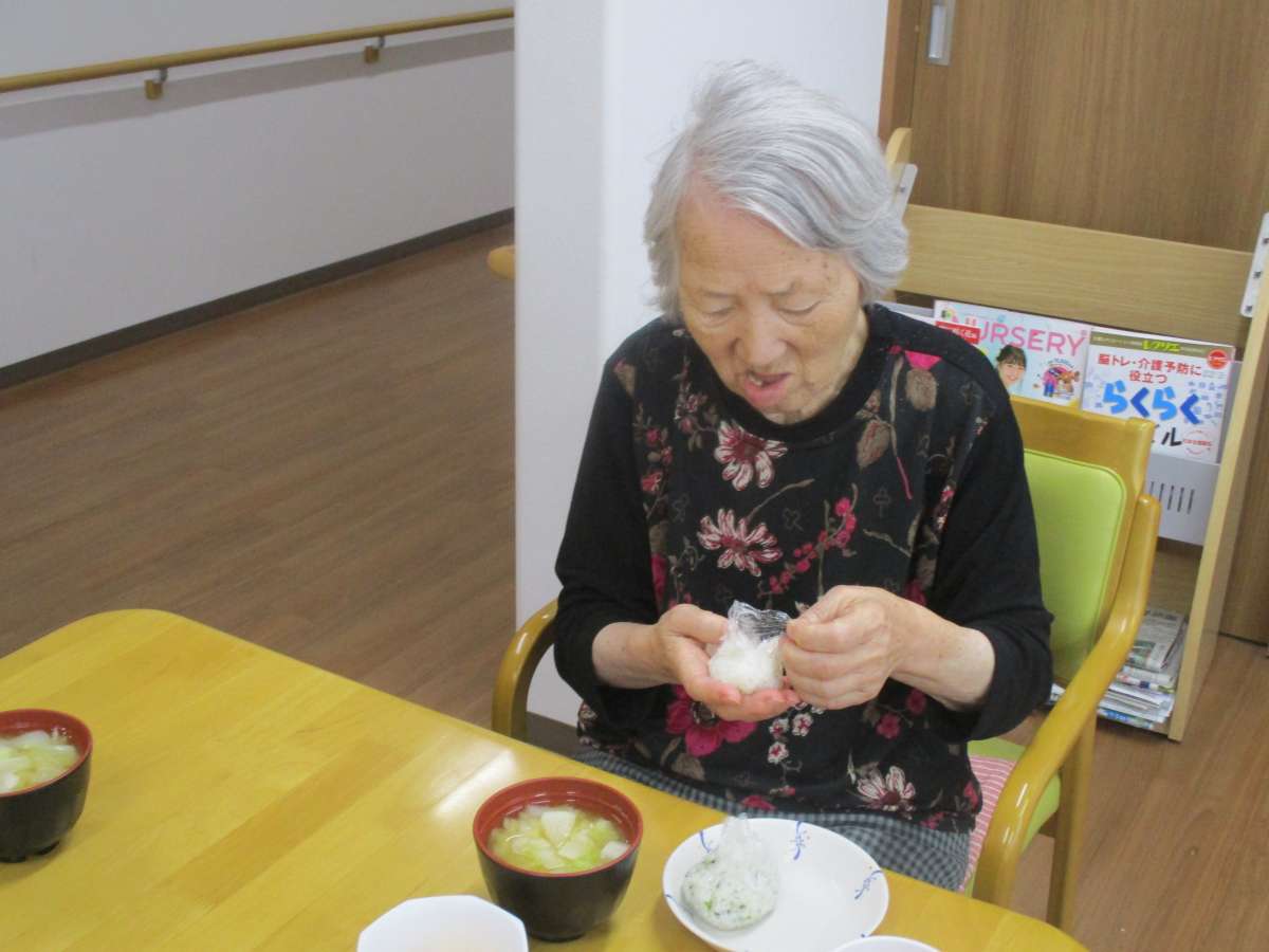 おむすびを作りました。中身は梅干しにサケフレークを具にしてむすびました。三角だったり丸かったりとそれぞれ愛嬌があり楽しんでいました・・・ 自分で作ったおむすび美味しそう~ 【早く食べたいよう・・】 待ちきれない様子でした!!