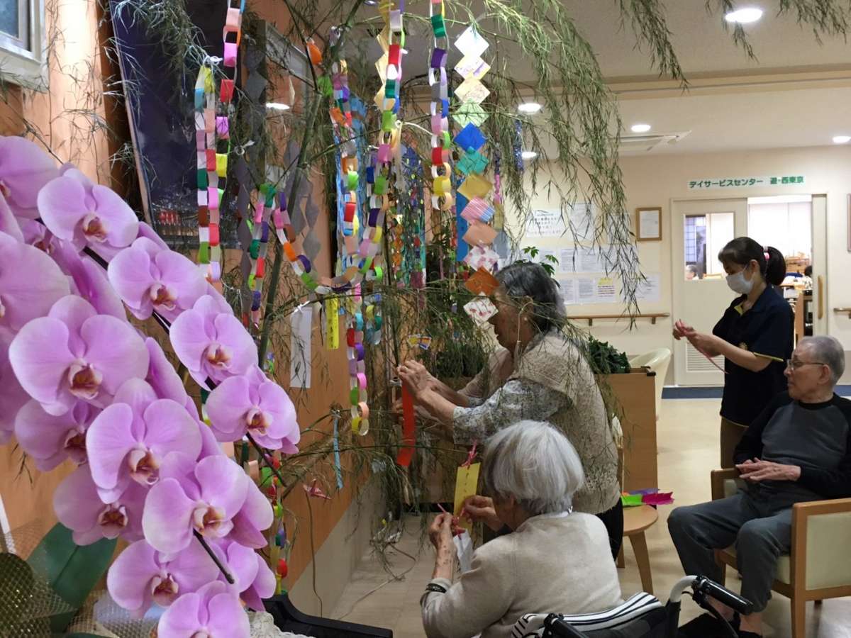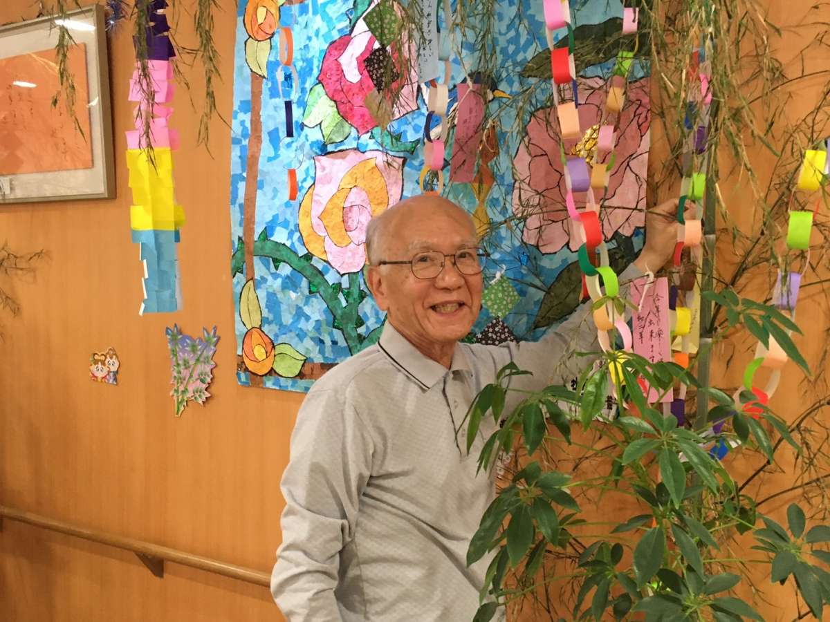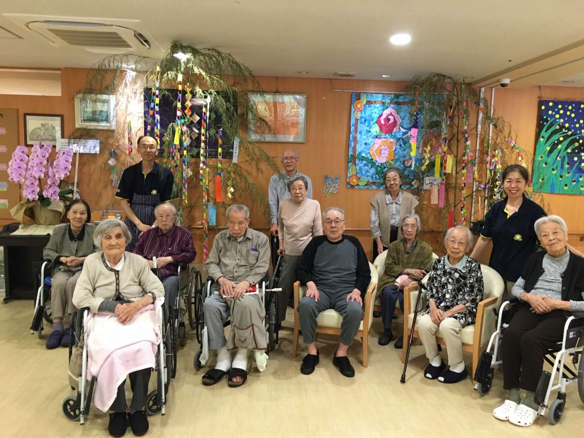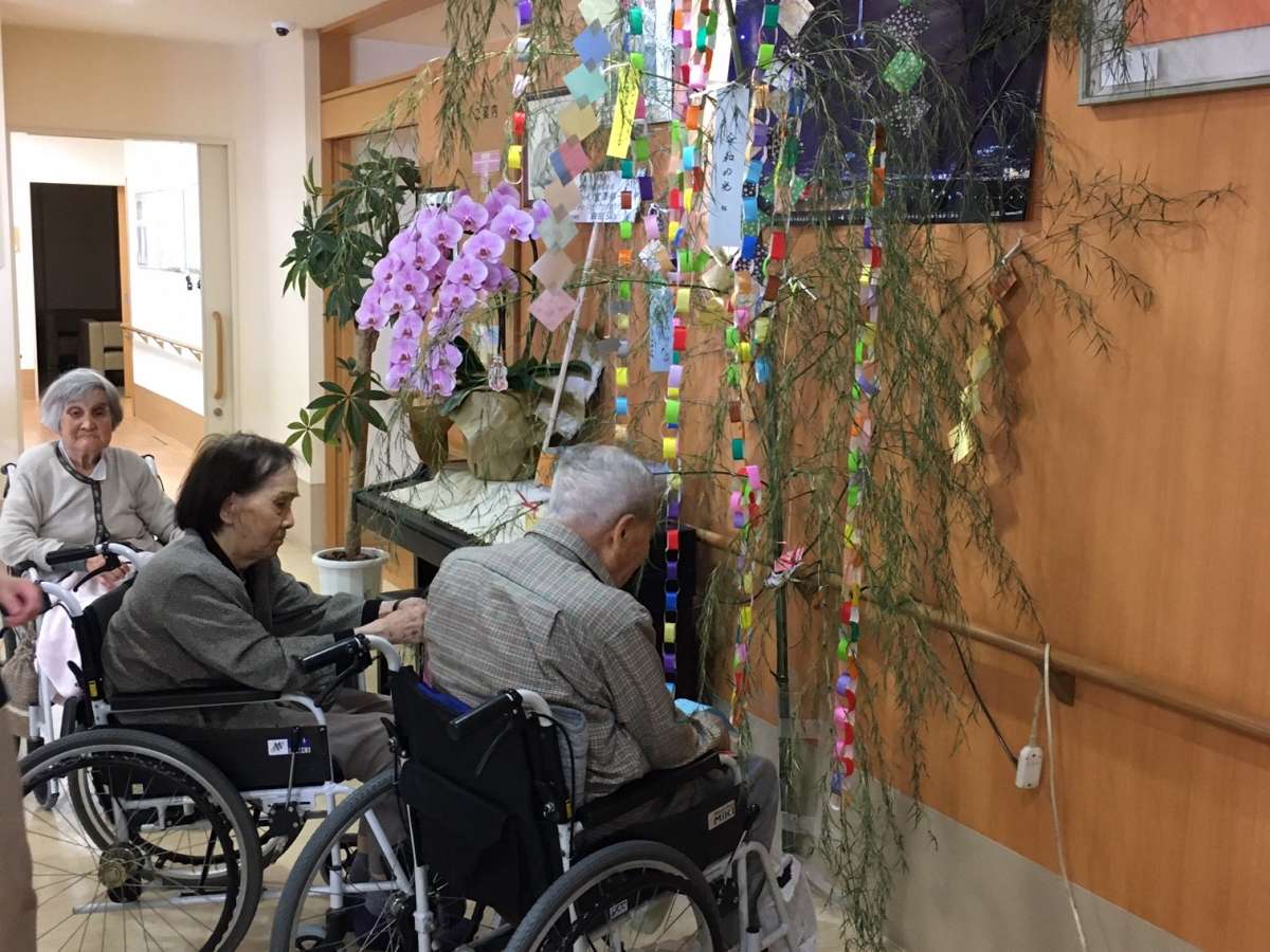 おやおや、たくさんのお願い事を込めて、ご入居の皆様が短冊を飾っていますね。どんなお願いをしているのでしょうか…? ご家族様の健康を願う短冊がたくさんありました。色とりどりに飾られていきますね。とても華やかです。
