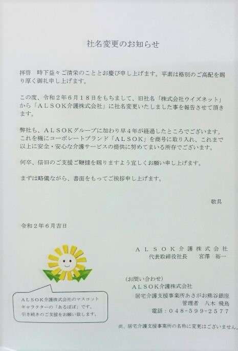さて、これまでブログをご覧頂いている方はご存知かもしれませんが、居宅介護支援事業所 あさがお熊谷銀座はALSOKグループの「株式会社ウイズネット」という会社が運営しておりました。ALSOKグループに加わり4年が経過した所ですが、本年6月18日をもって「ALSOK介護株式会社」に社名変更いたしました!