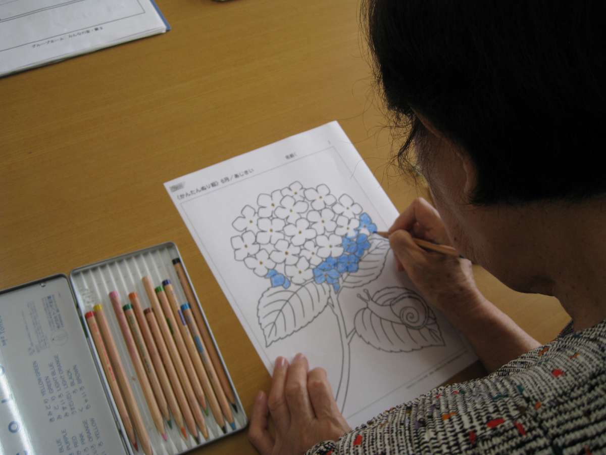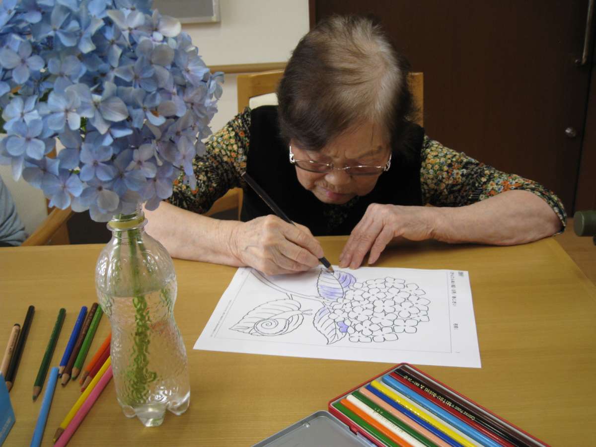 梅雨入りですから室内で何かできない事ないかなと思い、塗り絵を提供しました。