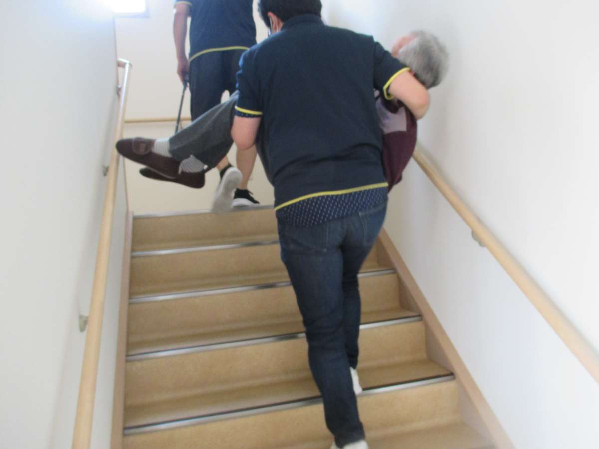 今回は水害想定で1階から2階への避難誘導を実施しました。