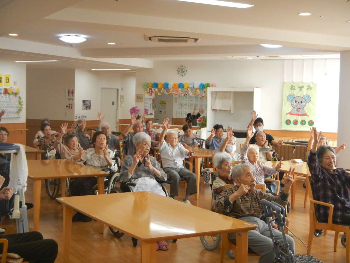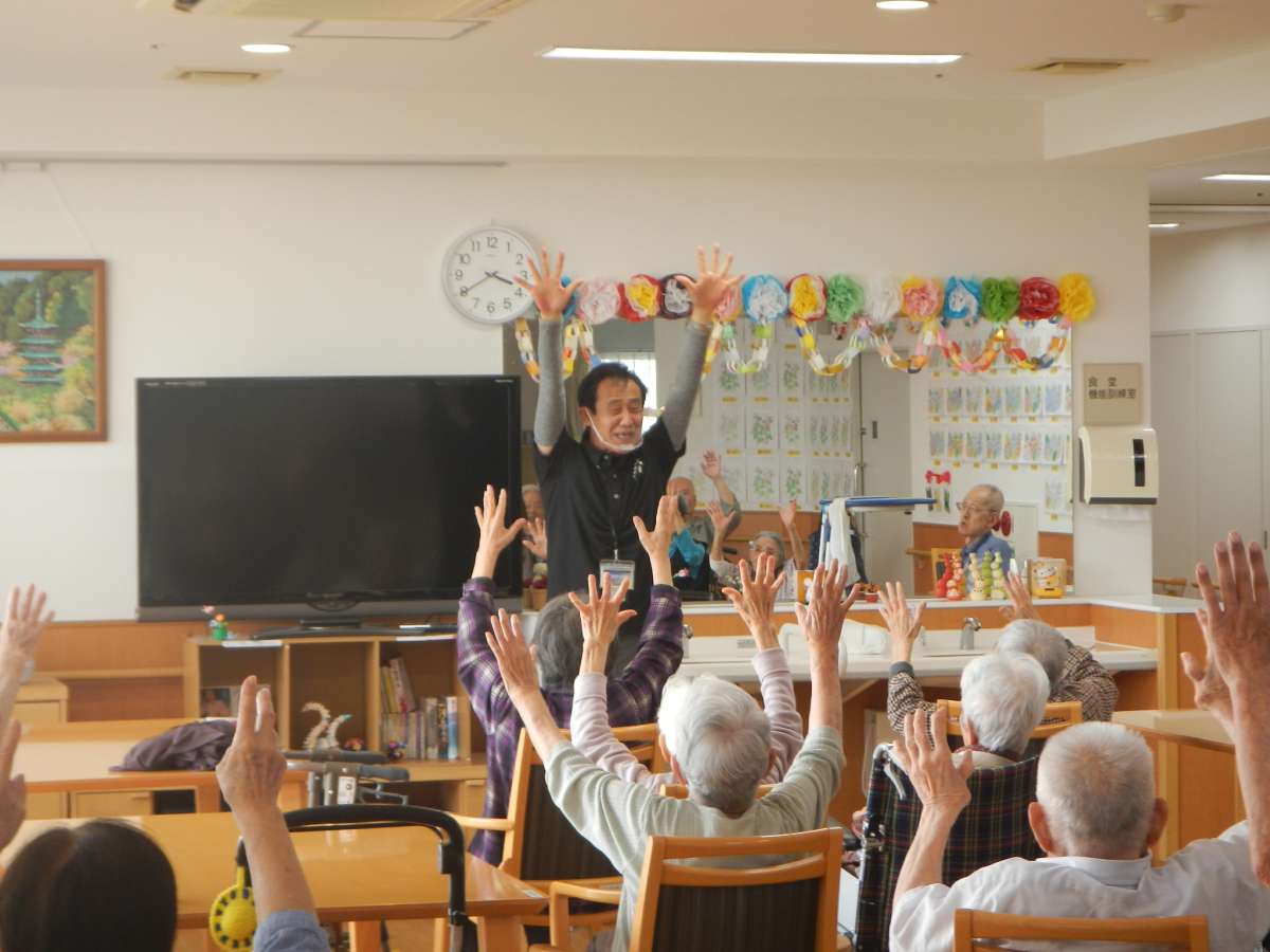 終盤では、当施設の職員が前に立ち、ご利用者様をリードする場面も。(先生のようにスムーズには出来ませんが・・・。)