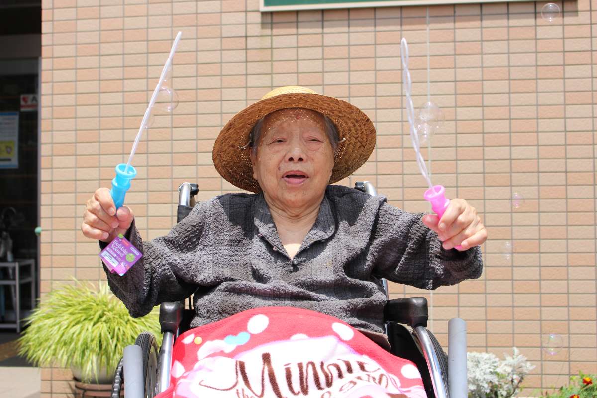 GH清河寺2では束の間の晴れ日に、ホームの外にてシャボン玉遊びを行いました。