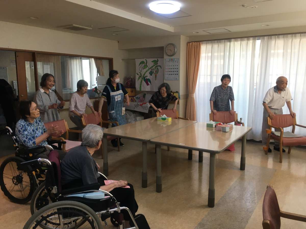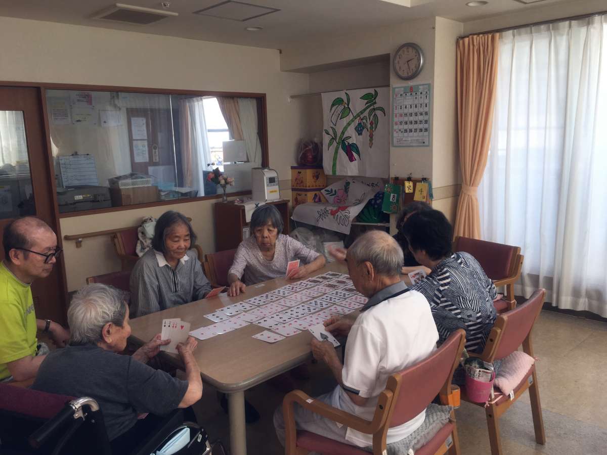 「暑い!」「暑~い!!」マスクをしながら働いている職員の口からつい出てしまう言葉です・・・。今日の午後も利用者様は、“トランプゲーム”“懐メロ合唱”“ALSOKあんしん体操”などのレクに参加・・・。健やかに・穏やかに・仲良くお過ごしです!