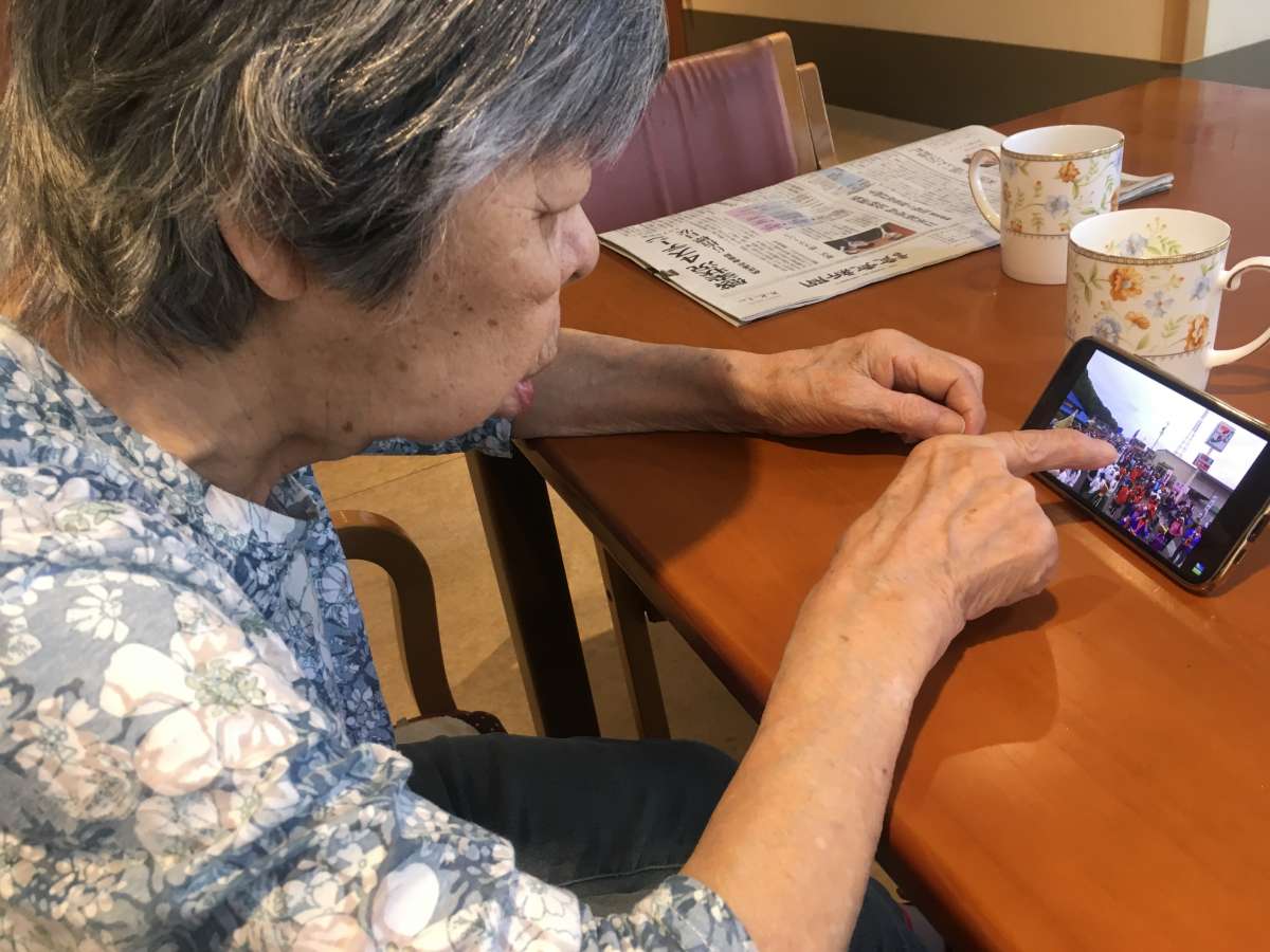 スマホの動画で去年の"上福岡七夕祭り"の様子を見ています。「これ、私かな・・・?」