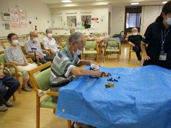 金魚を(ビーダマを色付きセロハンで覆う)ポイで(針金で輪っかを作り白い画用紙を貼った物)
