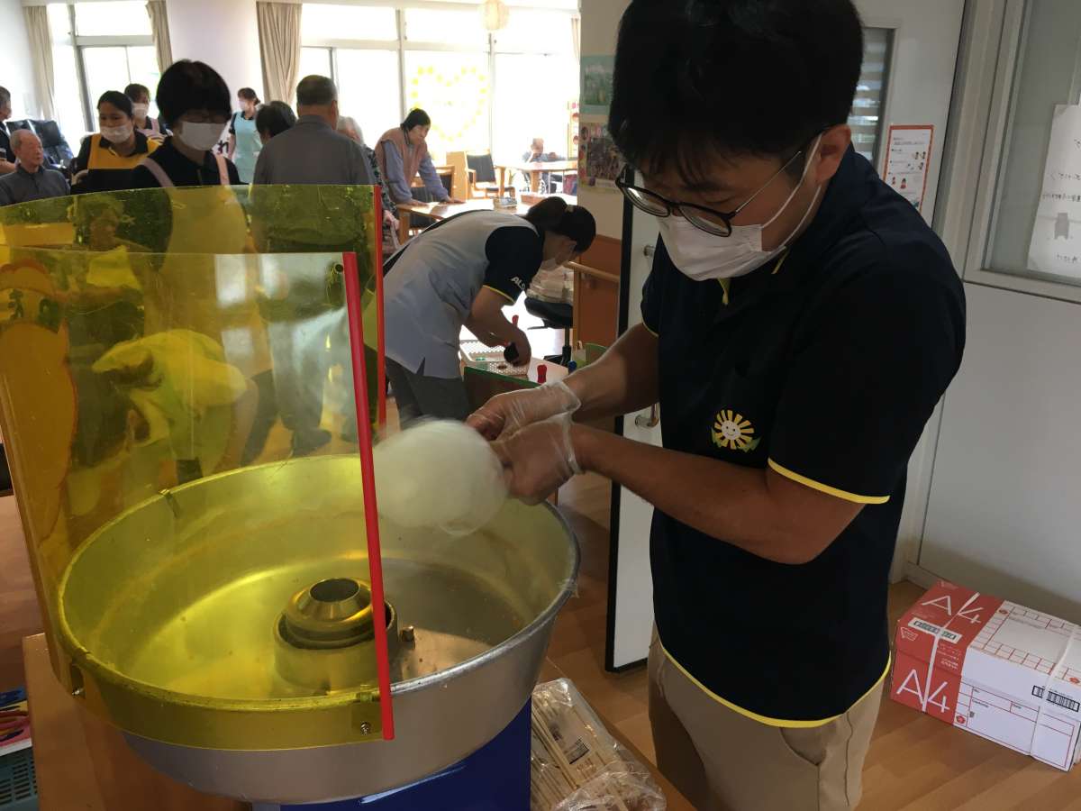 また、ゲームを待つ間は暇を持て余さないように、綿あめ職人(機能訓練指導員)による特製綿あめをプレゼント。