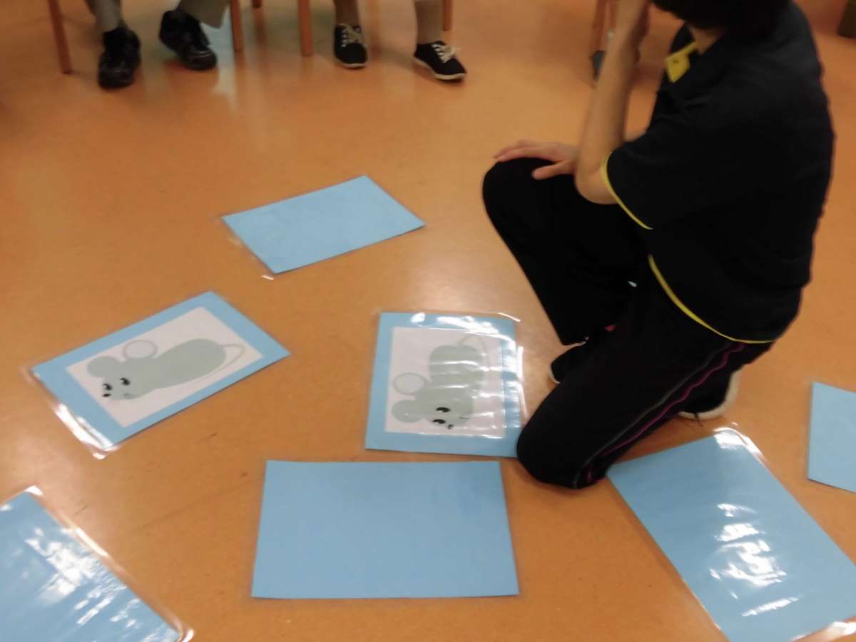 通常ならばよくあるトランプサイズのカードを使うと思いますが、今回は割と大き目な紙を使い神経衰弱として行いました。
