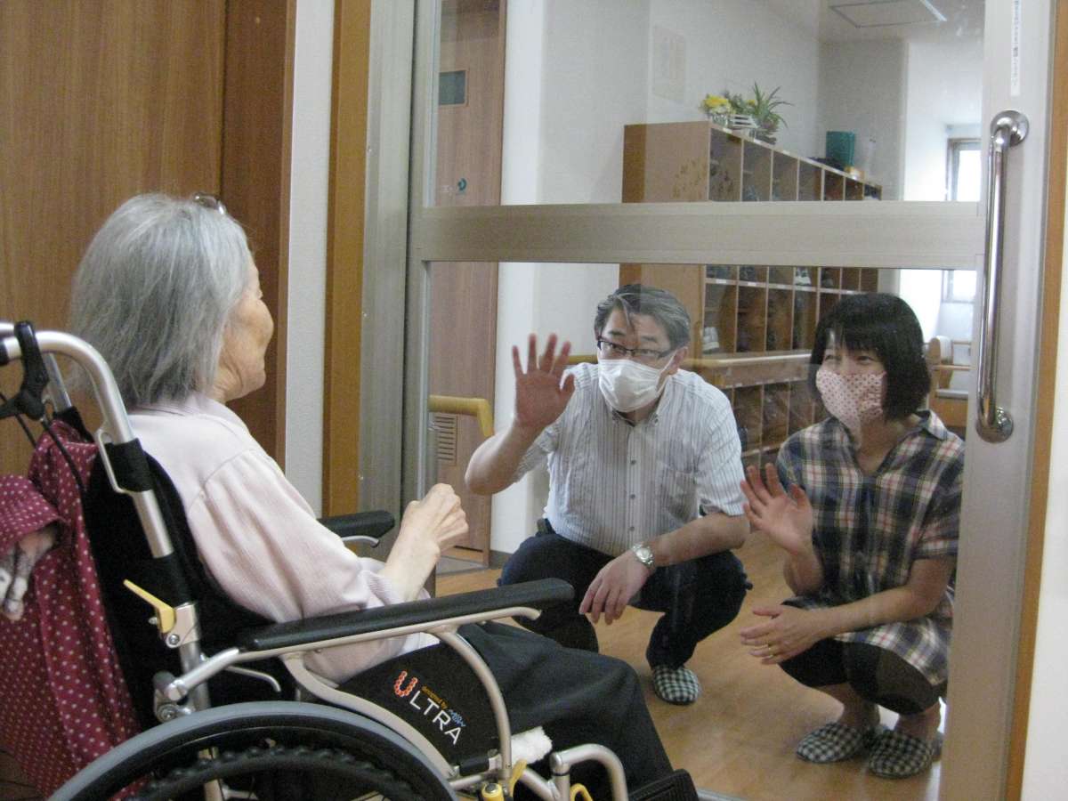 再度面会が中止になり、GHあきがせではご家族様に安心して頂けるように硝子越しの面会を行いました☆ 少しでもお元気なお姿をご覧頂きたく思います。暑い中有り難うございます!!皆喜んでおります。ただ、何でここは開かないのかしら・・・・ ちょっと寂しそうです。がまんがまんです!!