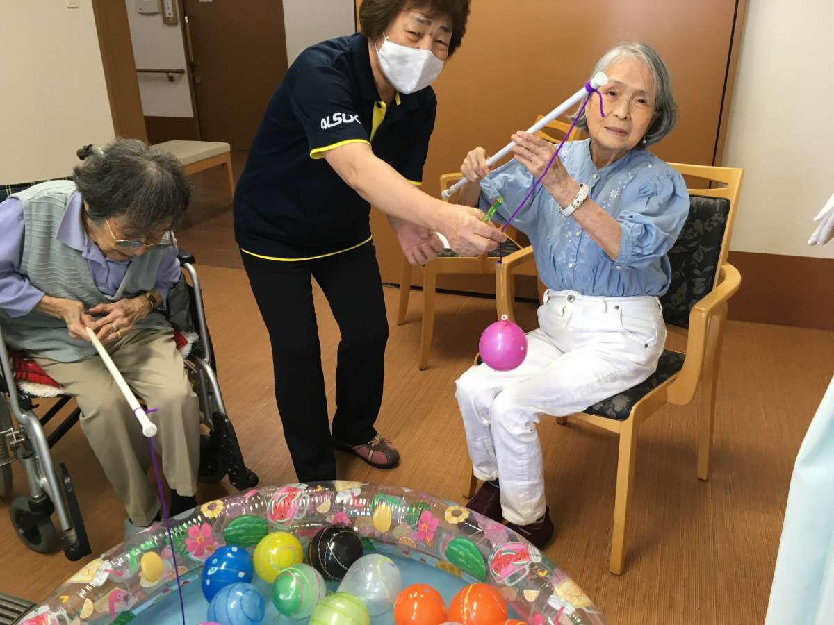 ゲーム(射的、ヨーヨー釣り、輪投げ)をしたり、8月のお誕生日の方のお祝いもしました。