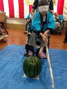 こんにちは!グループホームみんなの家・三郷2です。ブログをご覧頂き有難うございます。8月20日に夏祭りを開催いたしました。今年も恒例のスイカ割りに挑戦致しました。腕に自信のある利用者様が挑戦しましたがスイカがとても大きく硬かったためかだいぶ苦戦されてました( ;∀;)勢いが良すぎて写真がブレてますがご了承ください(笑)