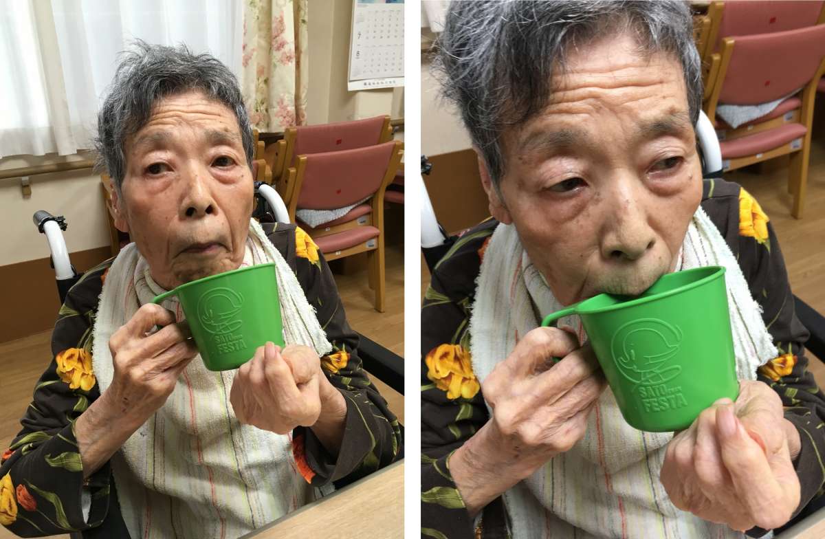 普段ご自分でコップを握られる際うまく掴めず一部お手伝いさせて頂くことがあるのですが……この日はしっかりと掴みお茶を摂られておりました(*’▽’)
