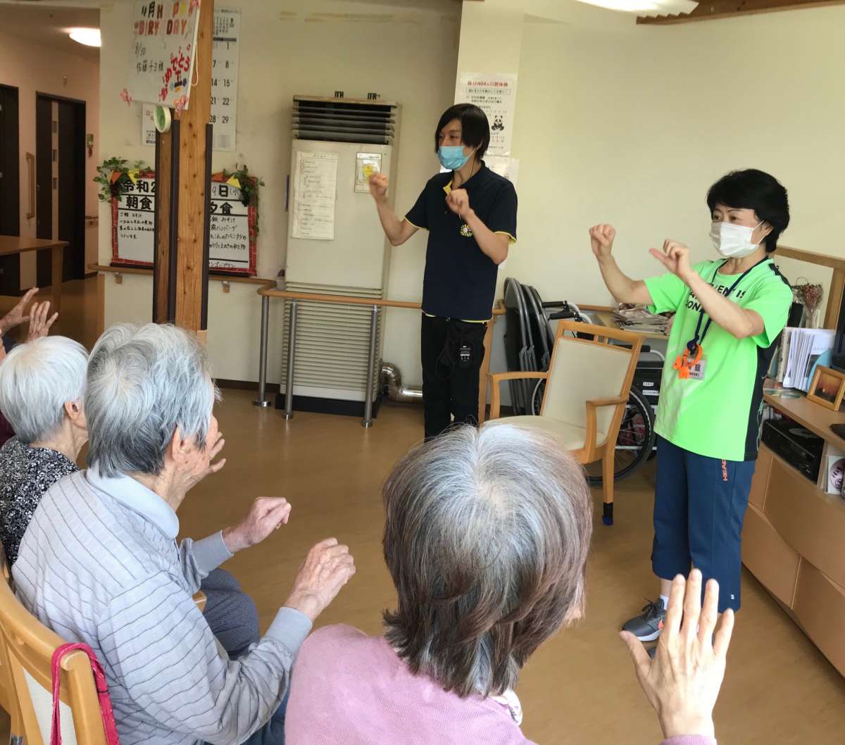 施設の中は、クーラー効いて過ごしやすい環境になっていますけど、夏バテ防止でみんなで体操だ(*´▽`*)