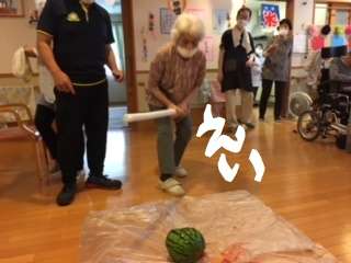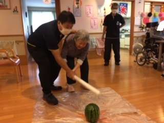 もちろん割れたスイカは職員が頂きまして入居者様は冷やしたスイカを食べました。