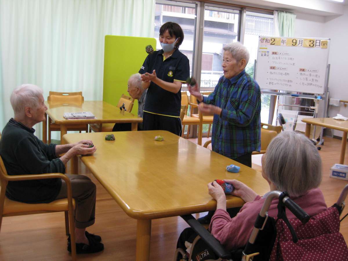 GHあきがせ ご家族様、手続りによろお手玉で遊びました。《あ~ 懐かしいね・・・ 昔よく遊んだよよ!! もうやってないから出来るかなから?》 やり始めはどうしていいかわからずにいましたが介護職員のを見ていると思いだしたかのように楽しまれていました。