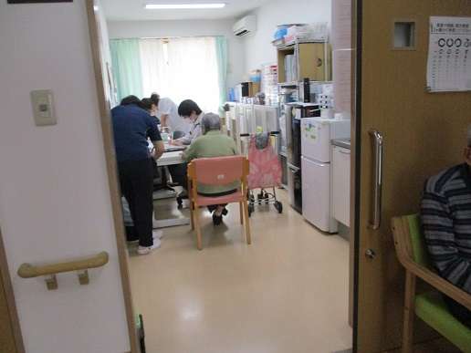 内科往診では医務室の前に皆様順番待ちして診察です!