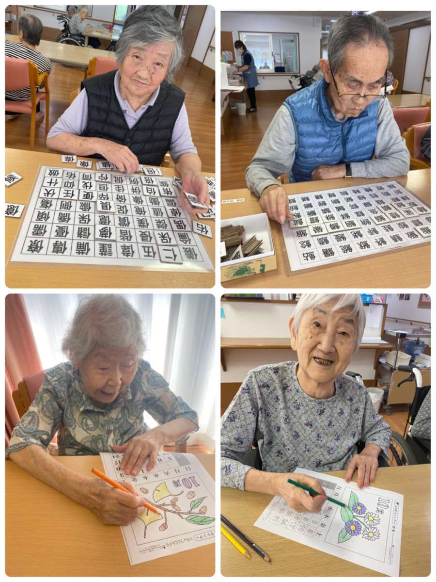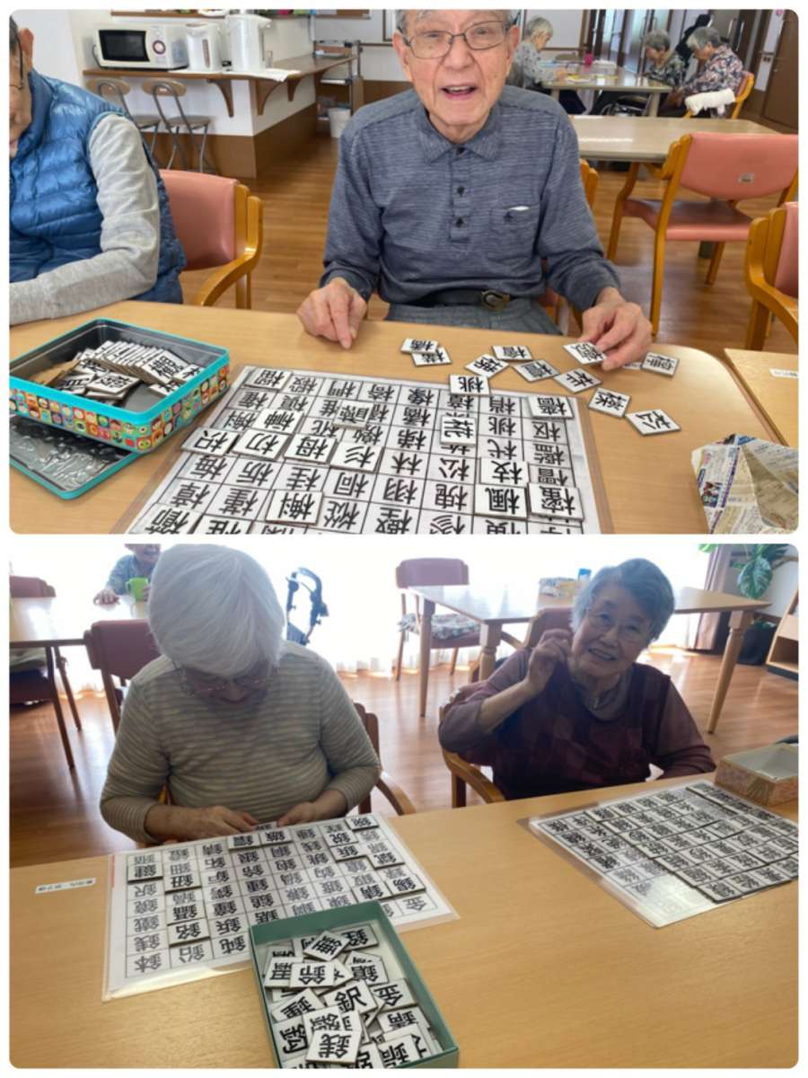 こんにちは。みんなの家・大宮内野本郷のコダマです(^。^) 花の丘公園そば。さいたま市西区。 宮原駅西口よりバス6分&徒歩4分のところにある施設です。 さて、内野本郷には職員お手製の『漢字パズル』が何種類もあります☆ にんべん・かねへん・木へん・魚へん・糸へんなどなど♬ 裏には読み仮名も書いてあり『なかなか読めないね、これは勉強になるね〜』『漢字は好きだから楽しい♬』など、皆さま大変集中して取り組まれています(^。^) 集中力も鍛えられ、脳トレになりますね☆ そして今日も皆様、昼食前にはしっかりと30分間『集団体操・口腔体操・早口言葉』に参加されていました(๑˃̵ᴗ˂̵)