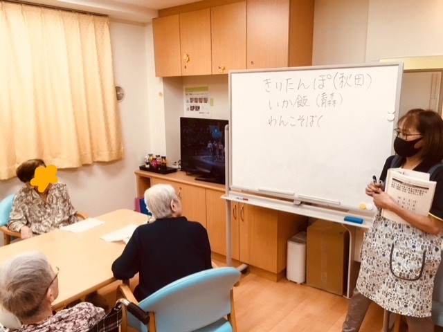 ホワイトボードを使って、先生(?)が「きりたんぽ」が有名な所はどこですか~?