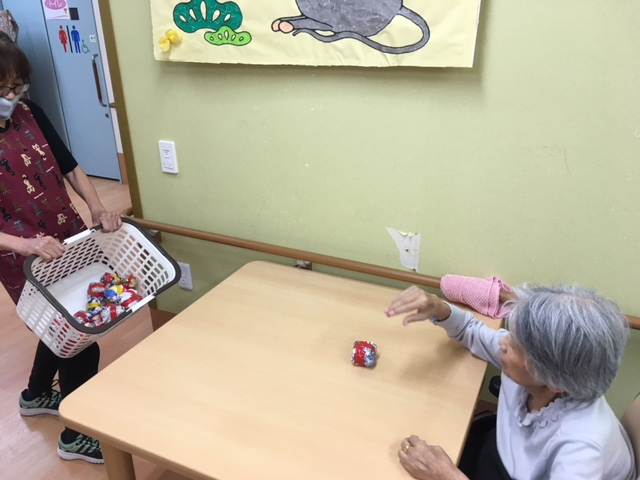 グループホームみんなの家・墨田で9/27日 2Fで早くも「運動会」に向けて「玉入れ」の玉をいくつか作って、早速玉入れの練習をしてみました。