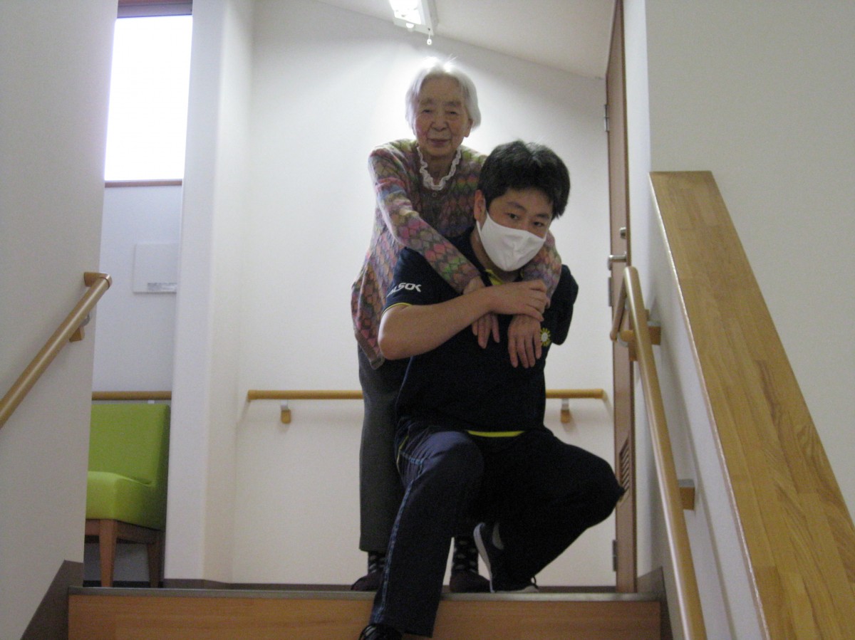 9/17 グループホームあきがせでは地震による設定での避難訓練を行いました。開始の合図で何するの、わかんないよ、やらないよ、いいよと仰られます。始めるとみんないなくなってしまうので仕方なく避難して下さいました。おんぶで階段を下りようとすると怖いねどうしようかねと話されるので安全の為付き添いの下階段で下りました。終わると何やったんだっけ?わからないけど楽しかったよ!と無事避難訓練が終えることができました。