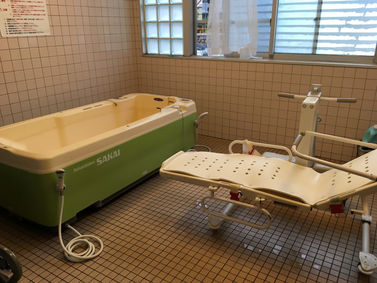 また、車椅子でのご利用者様用としまして機械浴もご用意しております。こちらも2名の介助者が付きますのでご安心下さい。