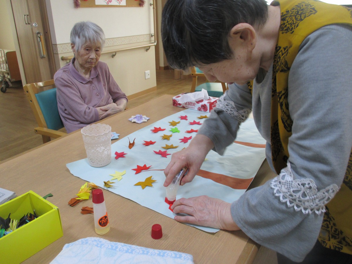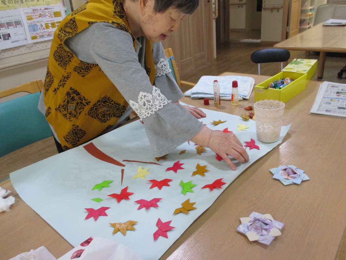 折り紙でもみじを作り、貼り付け、色とりどり紅葉が飾られました。