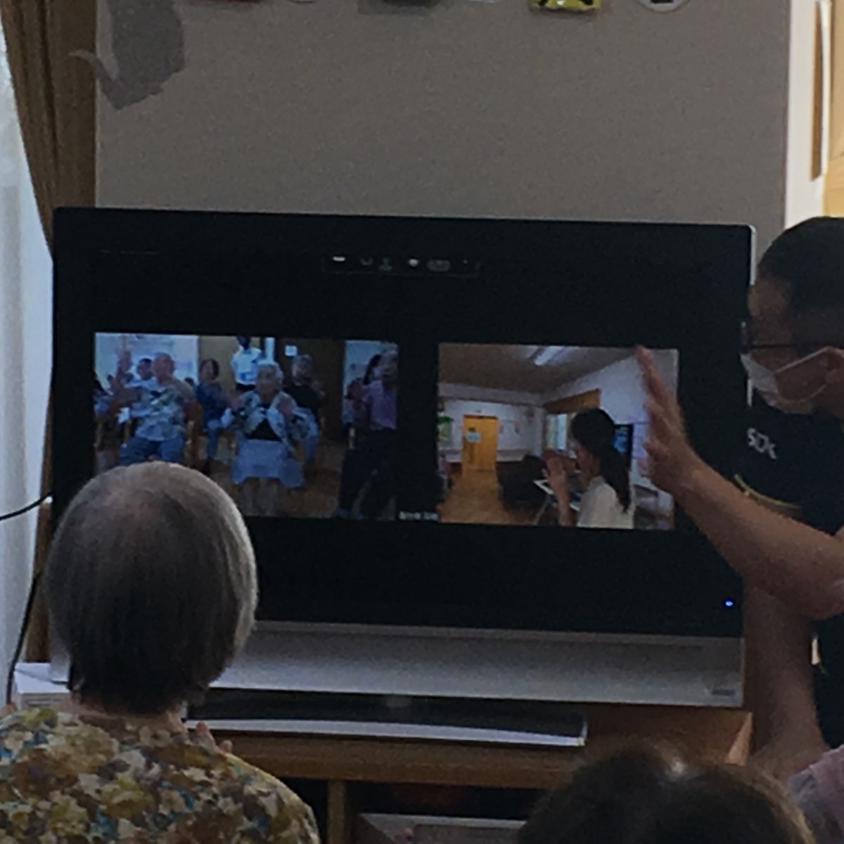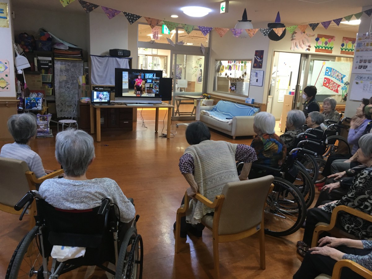 テレビの画面には体操の先生と グループホームみんなの家・戸田の皆様が映っています。