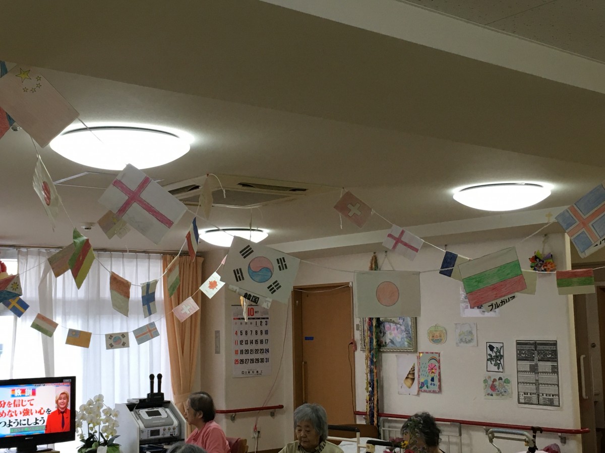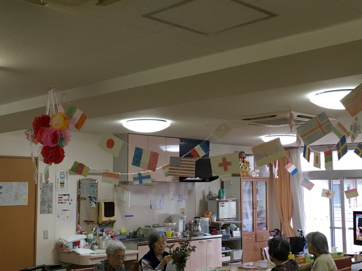 様々な手作り国旗に色を塗りながら、作製して頂いております。