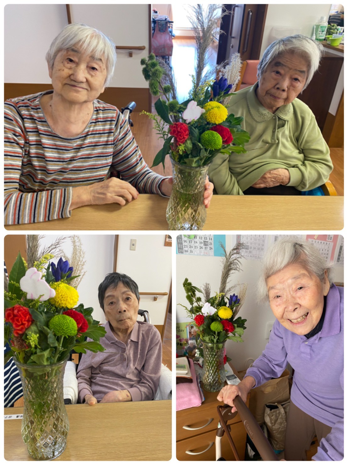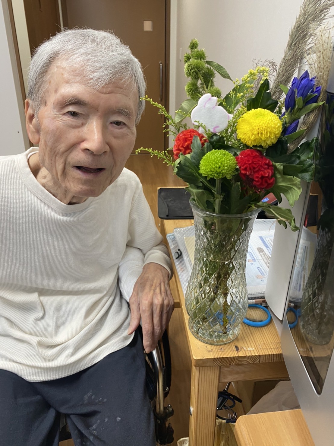秋がやってきて♡どんどん空が高くなり雲が綺麗に見えたり空気が澄んでいきますね。 先日の『中秋の名月☆』、皆様は『お月見』されましたか(^。^) 我が家のバルコニーからも、まんまるなお月様☆を見ることが出来ました♬本当に綺麗でした♡ お月見団子を作ったりススキを飾ったり、お月見ならではの『日本の楽しみ方』がありますね☆ 本日の二階の入居者様方のご様子です(๑˃̵ᴗ˂̵) 『やっぱり生のお花やスズキはいいねぇ♬』と、沢山の笑顔が見られました♡