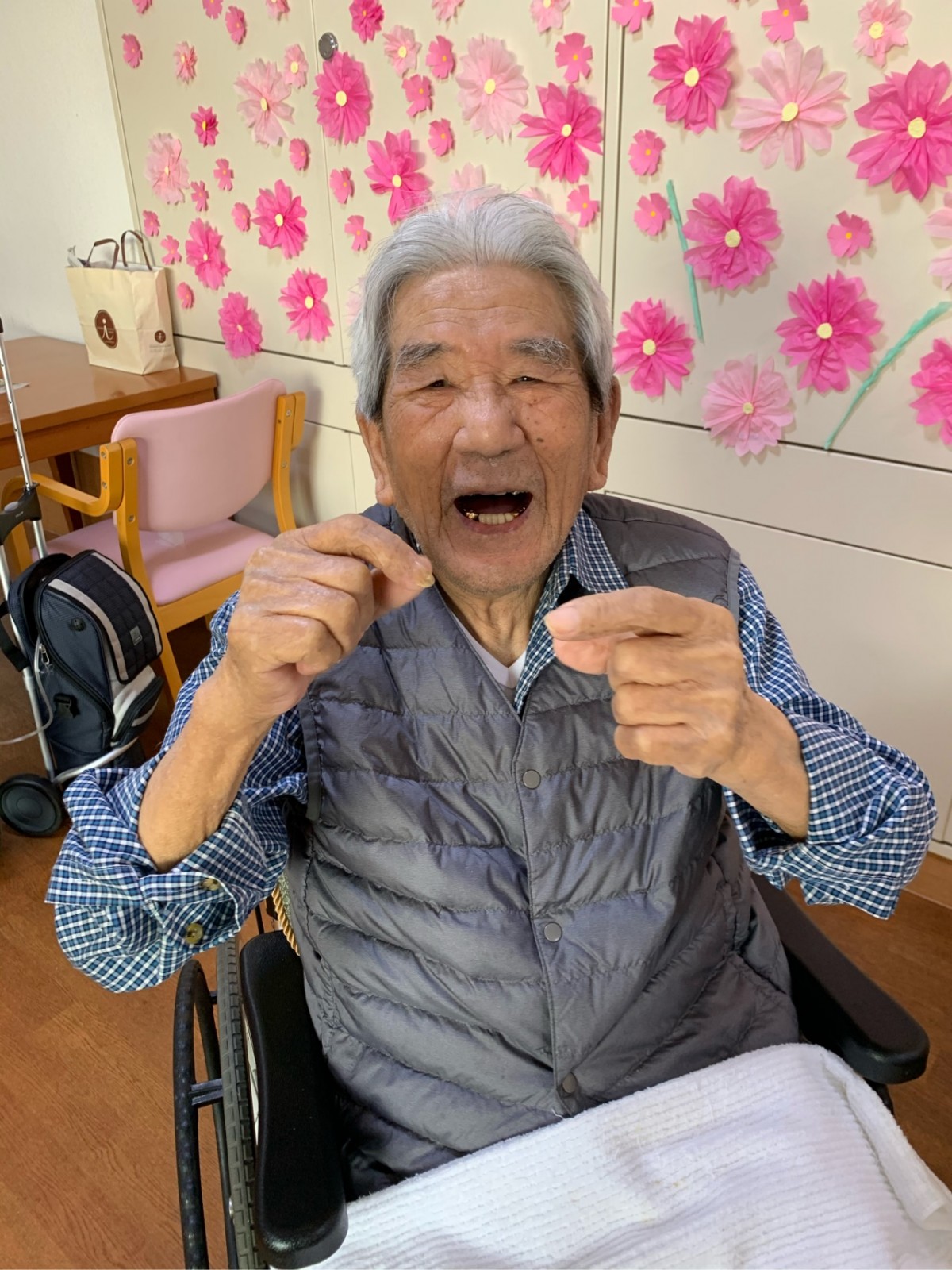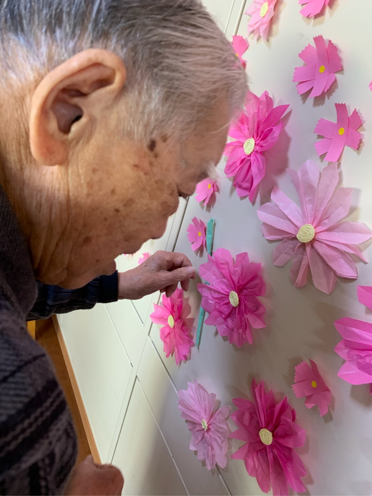 入居者様が「どこに貼るんだ」と、職員が「このあたりでどうでしょう?」と言うと