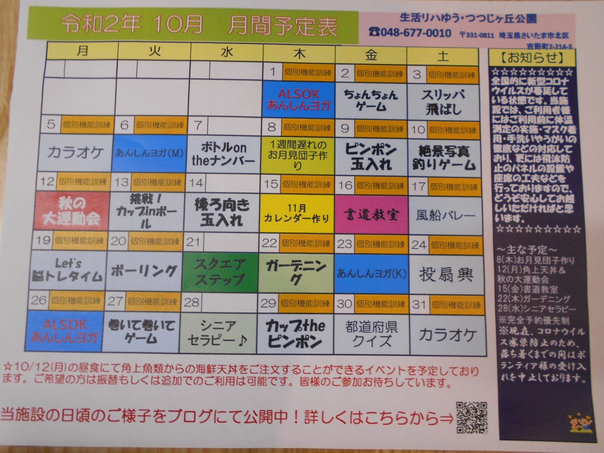 遅くなりましたが、10月のレクリエーションカレンダーをアップします!