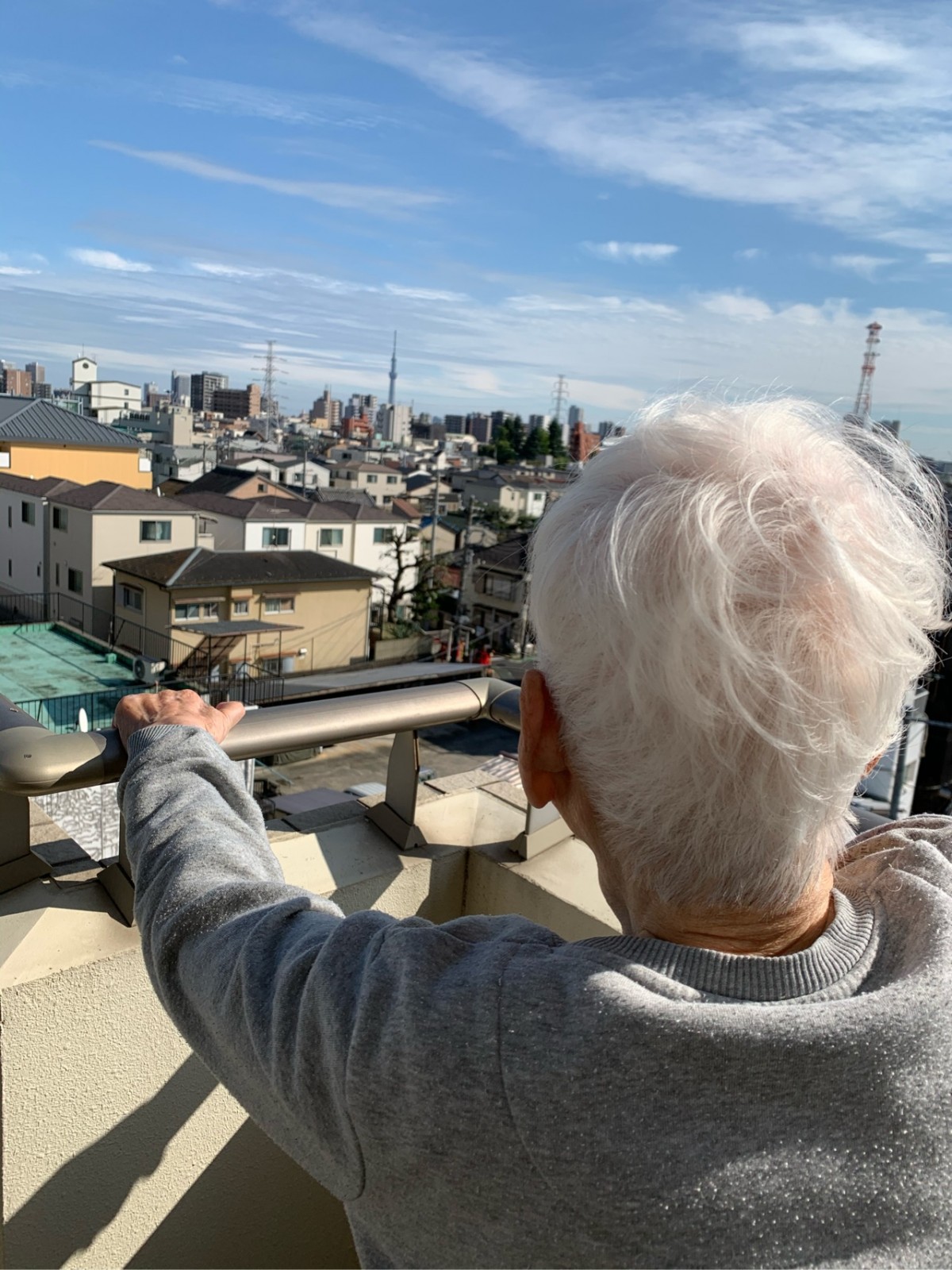 手すりに捕まって、スカイツリー見えますね!って、力強く手すりを握っておられます。