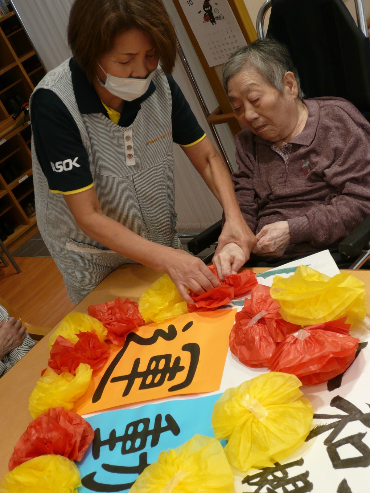 皆様、おはながみを広げて頂き周りに貼っていく作業をして下さりました!