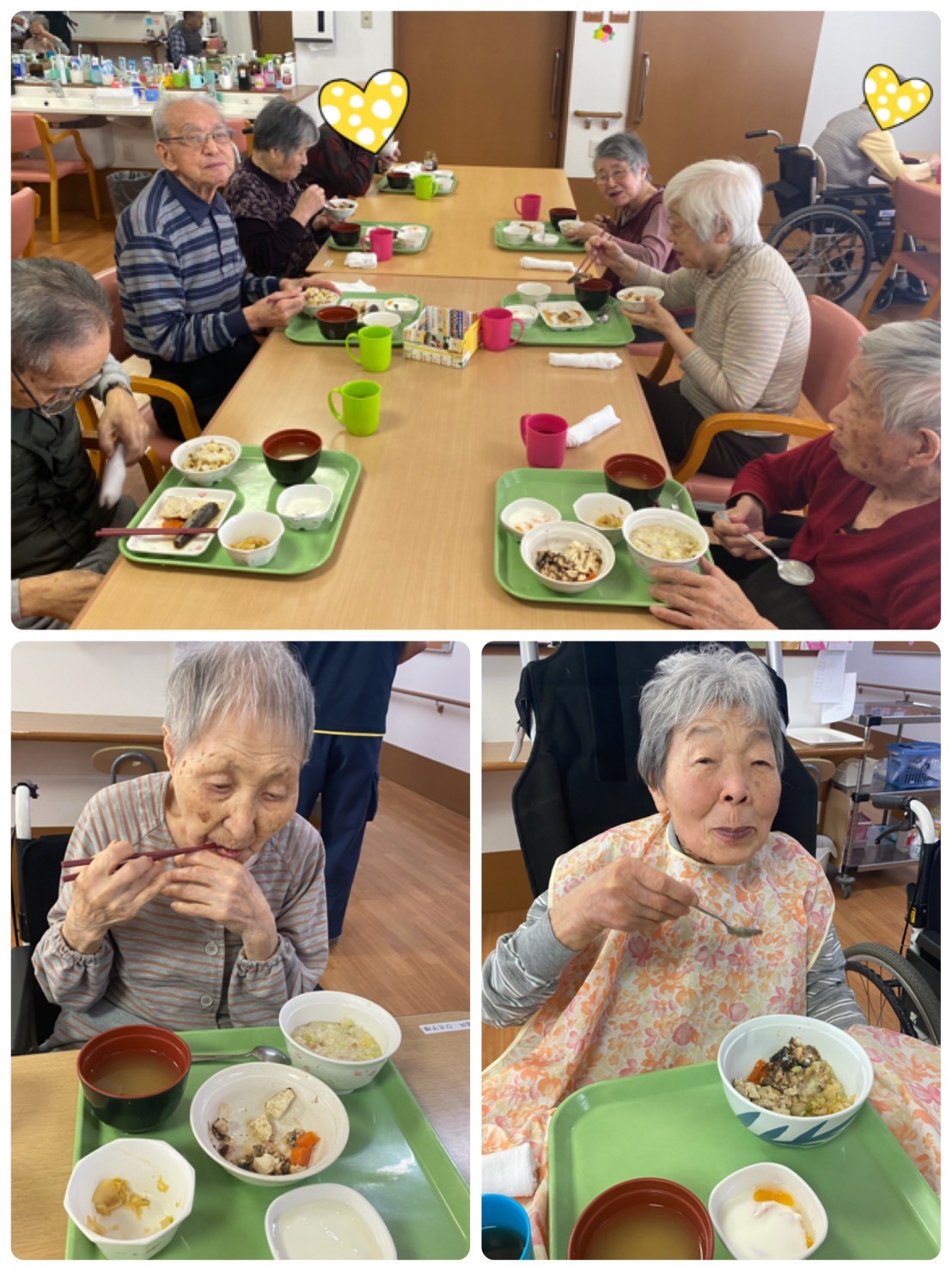 今日もしっかりと『集団体操・口腔体操・早口言葉・音楽体操』でお身体を動かされました(๑˃̵ᴗ˂̵) そしてお楽しみのlunchは、今日は特別メニュー♬ 『もぶり飯って何〜?』な皆様からのご質問に、早速ネットで調べてみました。 愛媛でお祝いの際や来客時など、人が集まる時に食する『バラ寿司』のことだそうです。 枝豆・こんにゃく・ごぼう・鶏肉・油揚げ・錦糸卵などが入っていて『美味しい!』と大好評でした♬ ほとんどの方が完食されていましたよ♡