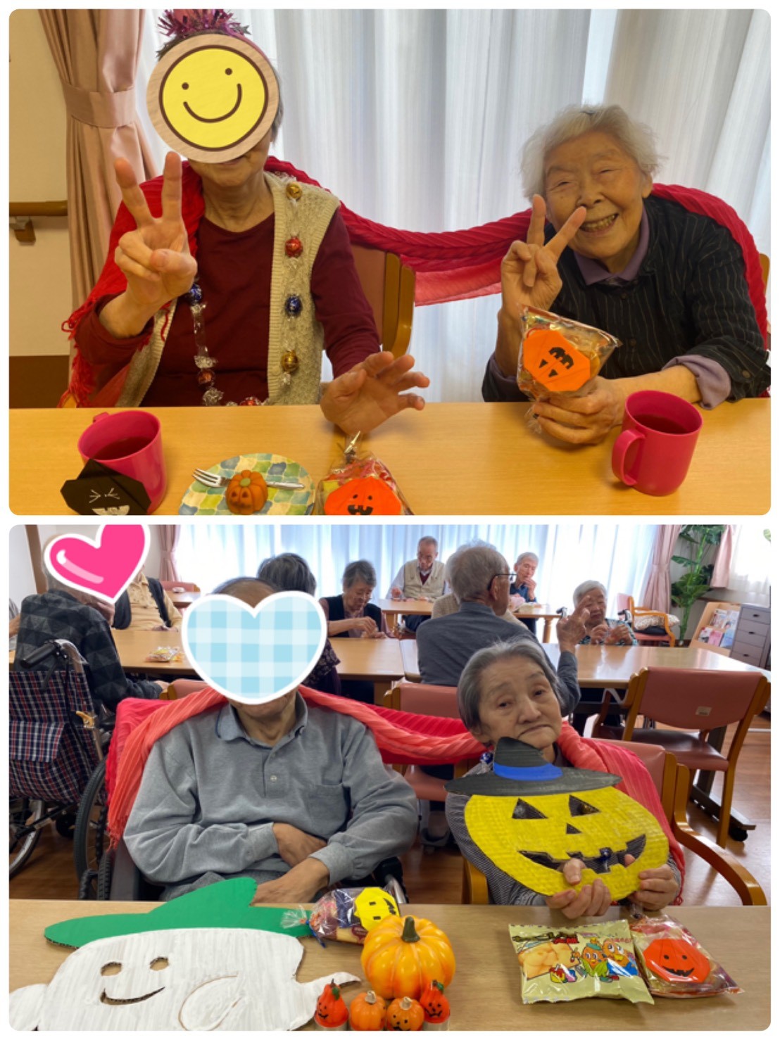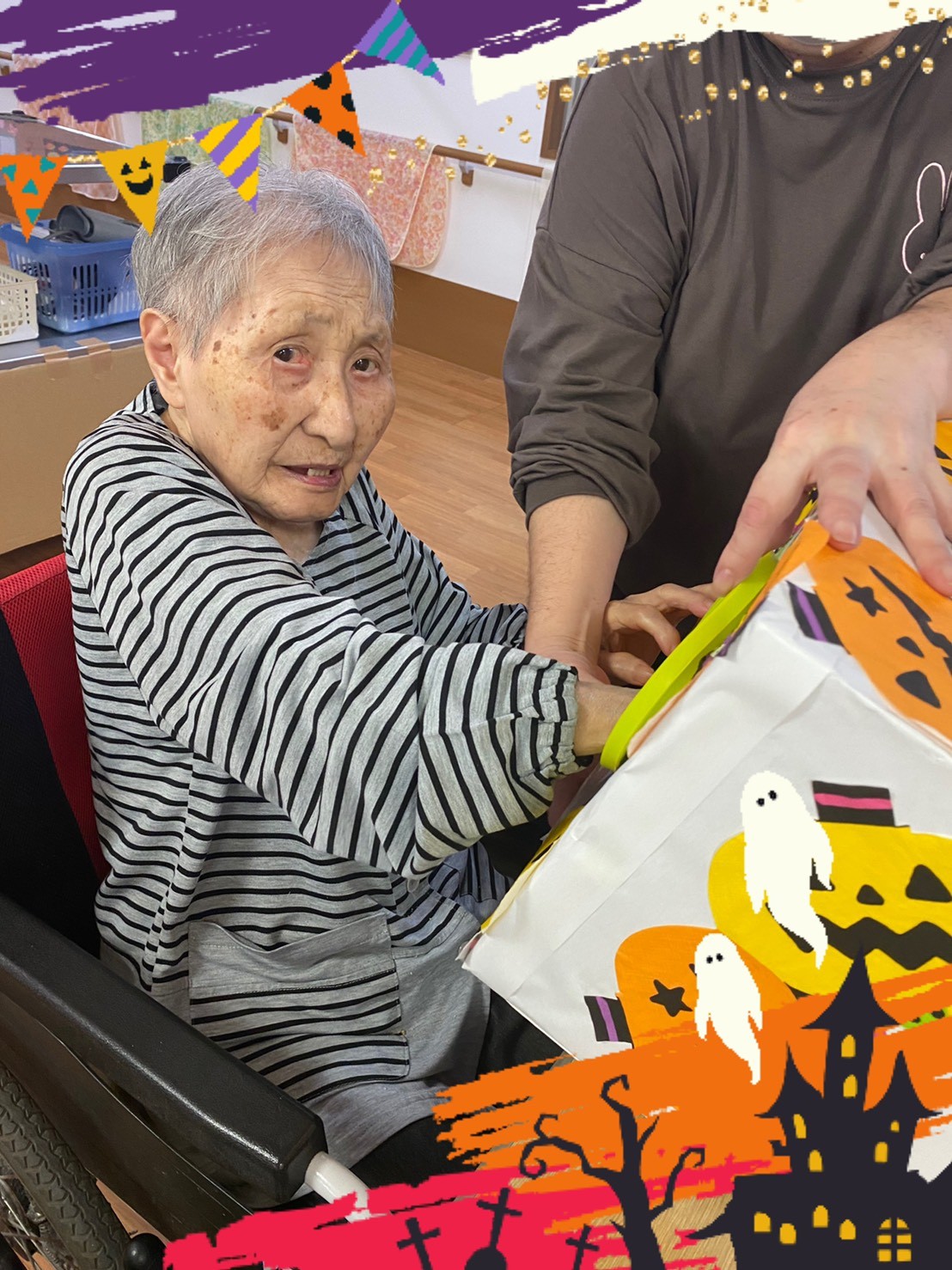 こんにちは。みんなの家・大宮内野本郷のコダマです(^。^) 花の丘公園そば。さいたま市西区。 宮原駅西口よりバス6分&徒歩4分のところにある施設です。 10月21日『ハロウィンパーティー♡』を開催しました(๑˃̵ᴗ˂̵) 美術が得意なWメンズスタッフが♡段ボールで一生懸命『おばけとかぼちゃ』を制作♬クオリティが高いですね〜☆ 施設から皆様へのプレゼント♡ お菓子の詰め合わせと『かぼちゃの和菓子』に・・・ 『中に白餡が入ってる!美味しいよ!』とテンション上がっていらっしゃいました(^。^)